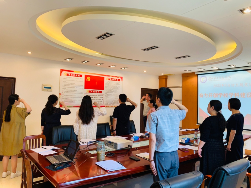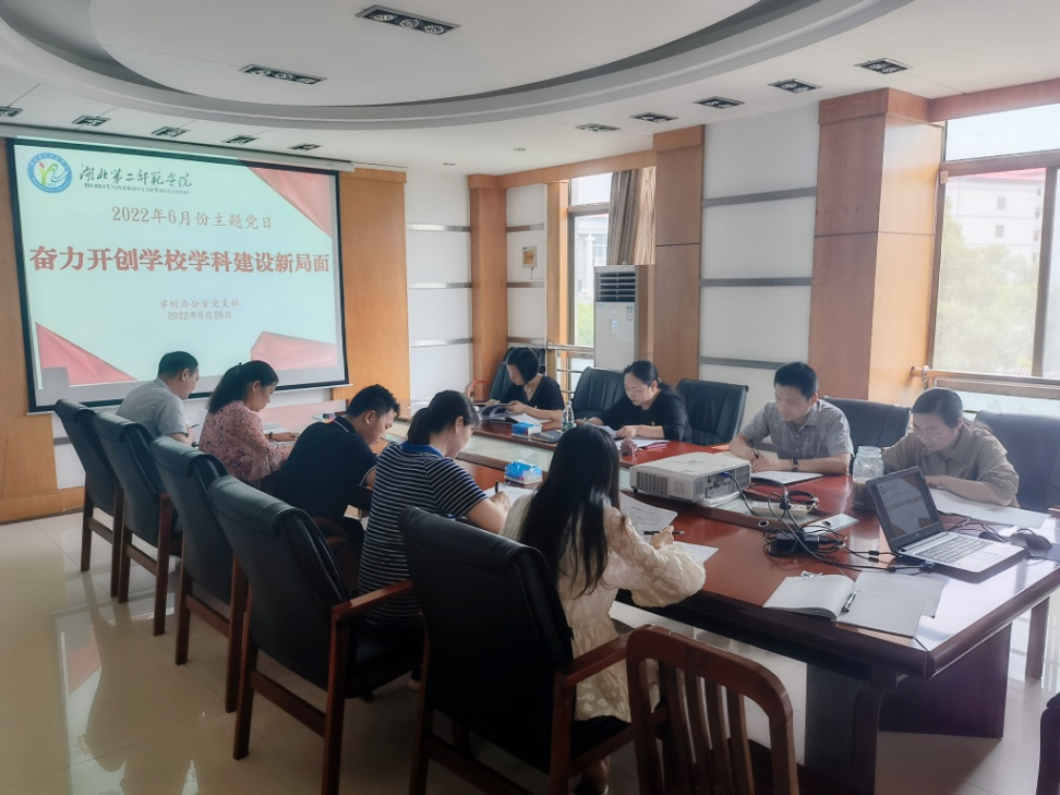 2022年6月28日, 学校办公室党支部开展了以“奋力开创学校学科建设新局面”为主题的主题党日活动。