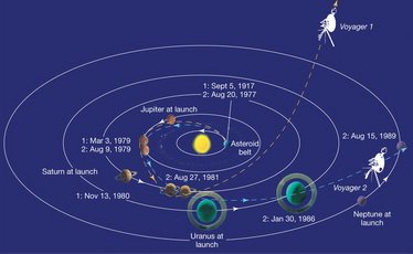(两艘旅行者号飞船的轨迹,旅行者2号是一次性探测星球最多的探测器。)
