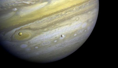 (旅行者1号给木星拍摄的照片,照片上还出现了木星的两颗卫星,还发现木星著名的“大红斑”是个巨型风暴。)
