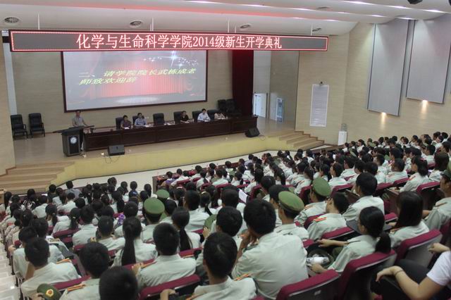 化生学院院长武栋成代表学院师生对新生的加入表示热烈欢迎,建议新生结交“运动场”和“图书馆”这两个朋友。常务副院长曾国平介绍了学院的专业设置、就业方向、省重点实验室等情况。副院长肖长清介绍了学生学籍管理及学院降级制度。学院特色社团“绿之翼”创始人07届优秀毕业生韩金总结了大学生活和奋斗史。